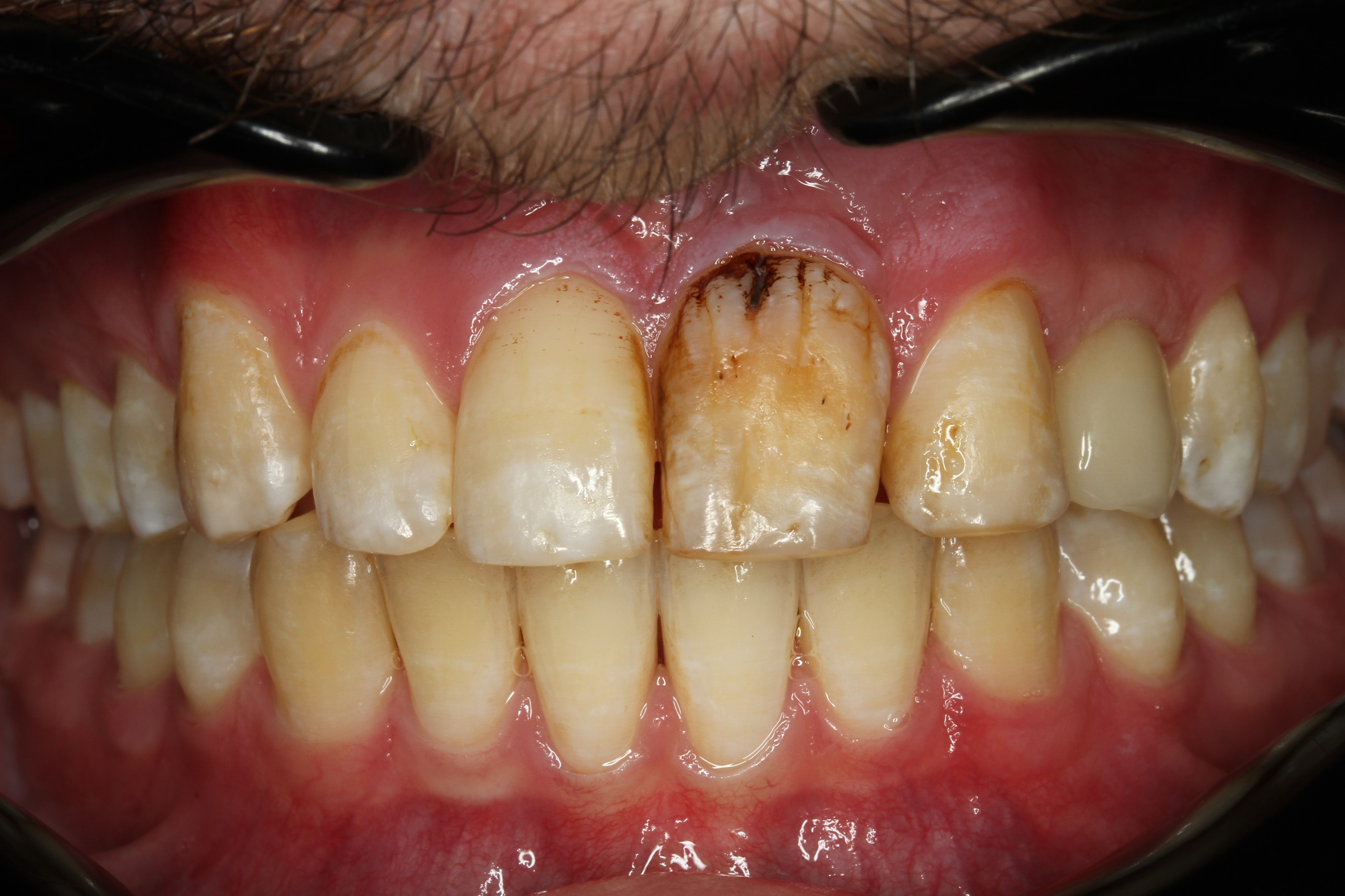 Pacient před bělením zubů prováděné stomatologem, tmavě zbarvený zub je vývojová anomálie, přání je estetický a harmonický úsměv